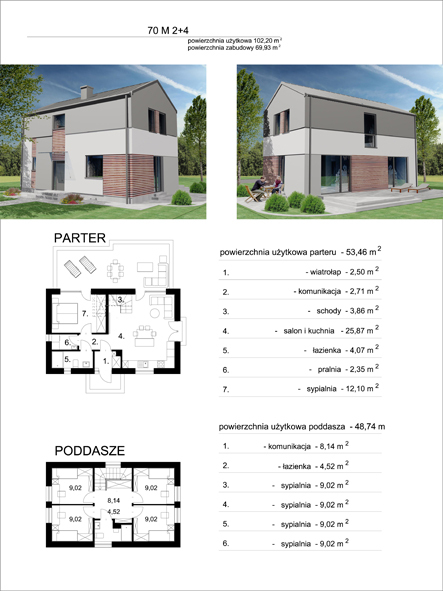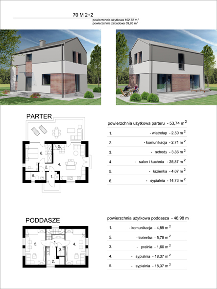 Projekt w dwóch wersjach, dla rodziny 2+2 i dla rodziny 2+4. Budynek mieszkalny jednorodzinny, parterowy z poddaszem użytkowym, niepodpiwniczony. Bryła budynku jest prosta, minimalistyczna i zwarta. Dach zaprojektowano jako dwuspadowy bezokapowy. Sposób ukształtowania bryły i elewacji jest możliwie prosty i nowoczesny.